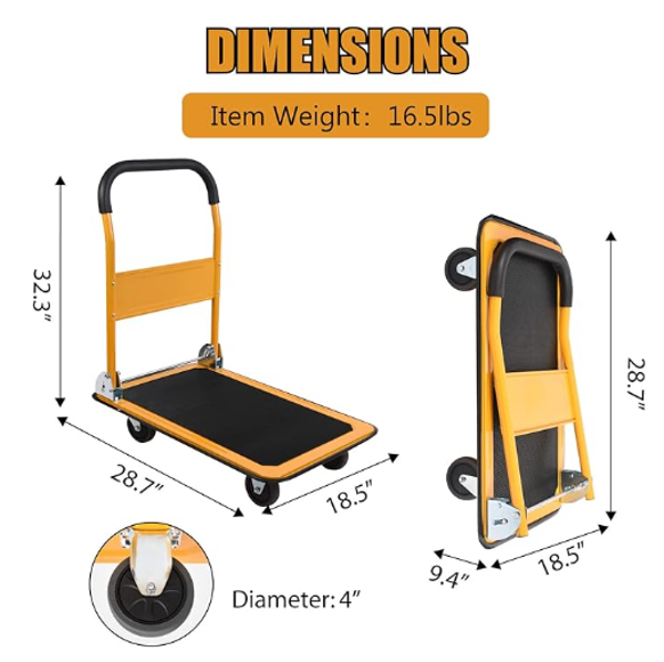 LEADALLWAY Foldable Push Cart Platform Cart 330lbs Capacity 4 Wheels 28.7x18.5x32.3inches Yellow Small Flatbed Cart