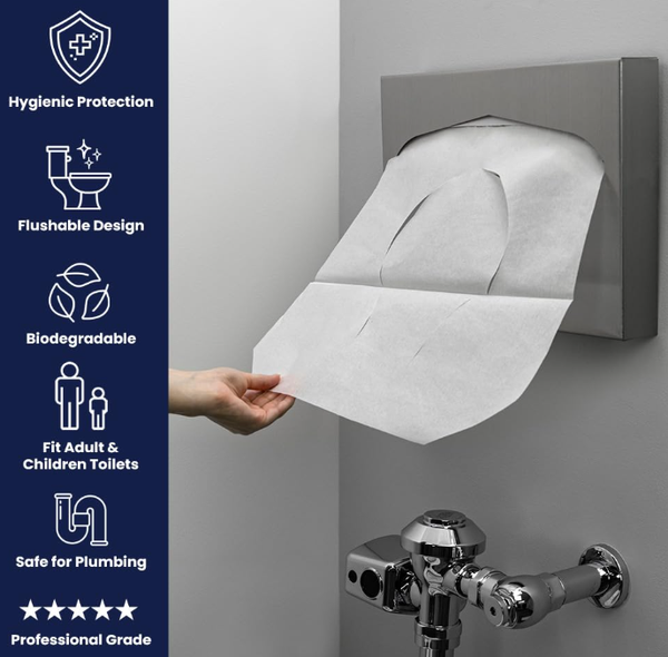 - Environmentally Conscious Toilet Covers: Our disposable seat covers for toilets break down naturally after use and are made from 100% recycled fiber content to help reduce waste