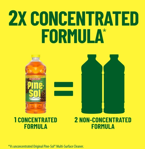 - 2X CONCENTRATED FORMULA (3): Pine-Sol Multi-Surface Cleaner, Original, has a 2X concentrated formula (1) that lasts 2X longer (4) and disinfects full strength or diluted